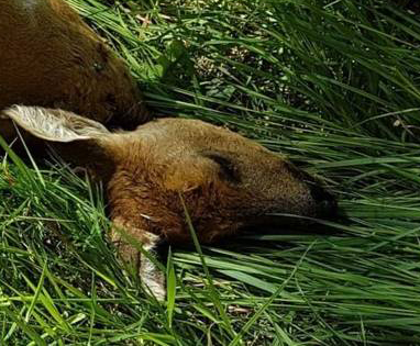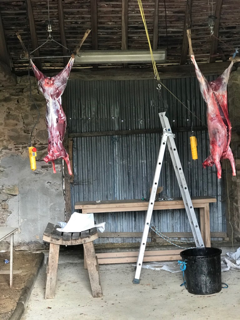 Soms kom je herten tegen onder minder prettige omstandigheden. Op een zaterdag maakten we een wandeling wat verder van ons vandaan, in de buurt van Benayes. Prachtige, zonnige ochtend. Op zeker moment liepen we op een schuur af waar aardig wat auto’s voor geparkeerd stonden. Dan weet je het wel als het weekend is: jagers. Het was inmiddels lunchtijd en we hoorden al van verre dat ze aan de dis zaten. Drankje erbij. Toen we de schuur passeerden zagen we ze zitten, aan een grote tafel. Ze leken tevreden. Van de schuur ernaast stonden de grote deuren open, en daar zagen we ze hangen, twee reeën, gevild en al. Ze hadden de ochtend niet overleefd. Een jonge jager kwam naar buiten en liet ons met trots hun buit zien.