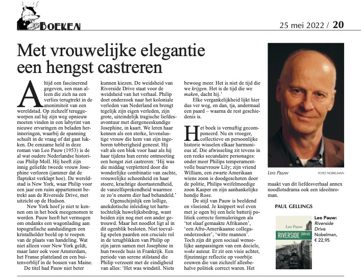 “De titel had Pauw niet beter kunnen kiezen. De weidsheid van Riverside Drive staat voor de weidsheid van het verhaal. Philip doet onderzoek naar het koloniale verleden van Nederland en brengt tegelijk zijn eigen verleden, zijn grote, uiteindelijk tragische liefdesavontuur met diergeneeskundige Josephine, in kaart. (…) Het boek is vernuftig gecomponeerd. Nu en vroeger, collectieve en persoonlijke historie wisselen elkaar harmonieus af. (…) De stijl van Pauw is beeldend en vloeiend.” ARGUS (lees hier de volledige recensie).