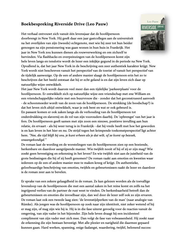 “Riverside Drive is een roman die mij diep geraakt heeft. Het is een boek waarin je een leven aan je voorbij ziet gaan, inclusief alle lessen en gevoelens die daarbij komen kijken, en waar je ook echt even van moet bijkomen. (…) Dat heeft Pauw ontzettend knap gedaan met deze dijk van een debuutroman.” DE BOEKENKRANT (lees hier de volledige recensie).